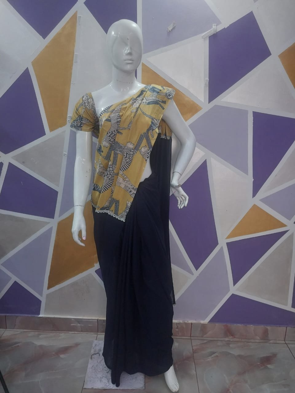 Half & Half Dark Blue and Mustard Yellow Wild Printed Saree with Blouse